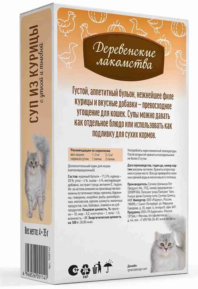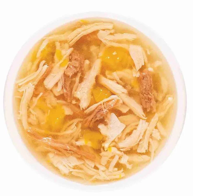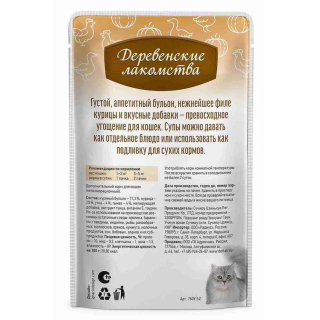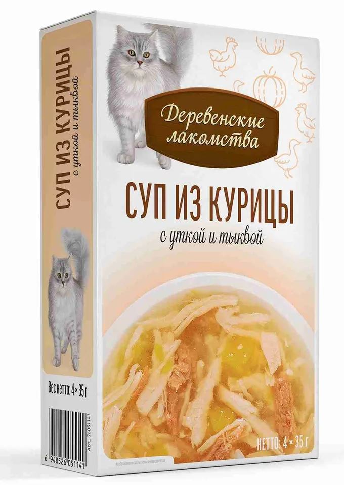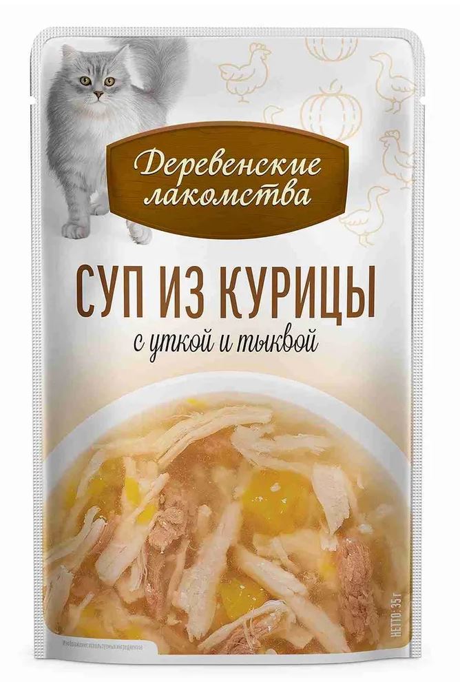 Деревенские лакомства Суп из курицы с уткой и тыквой - нежнейшее филе курицы, утка и тыква получили идеальное сочетание с густым бульоном в супе для кошек.