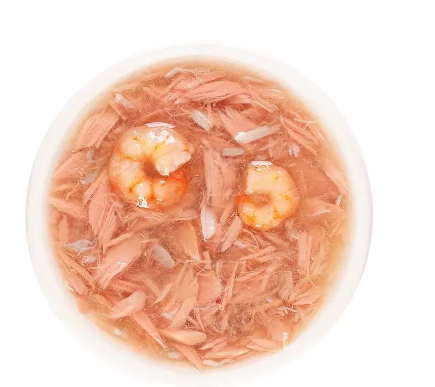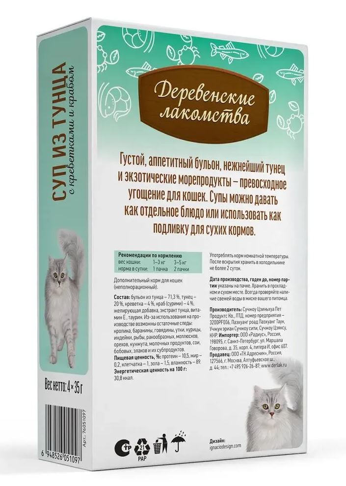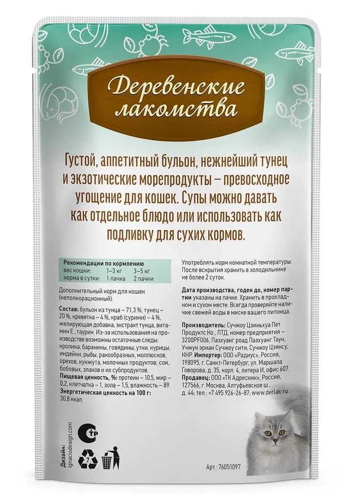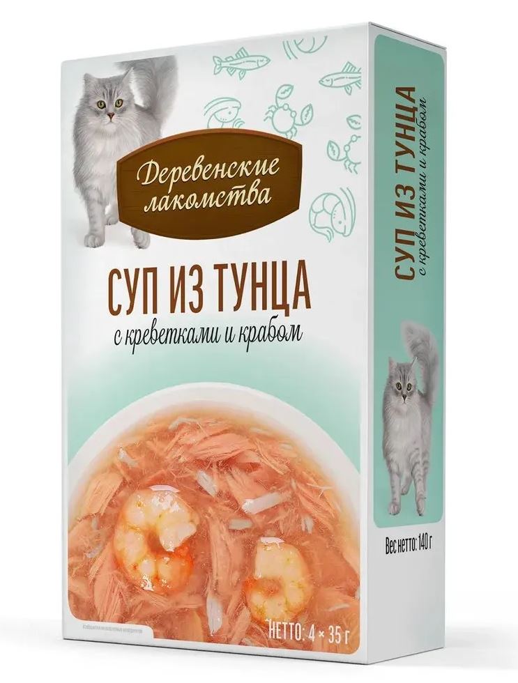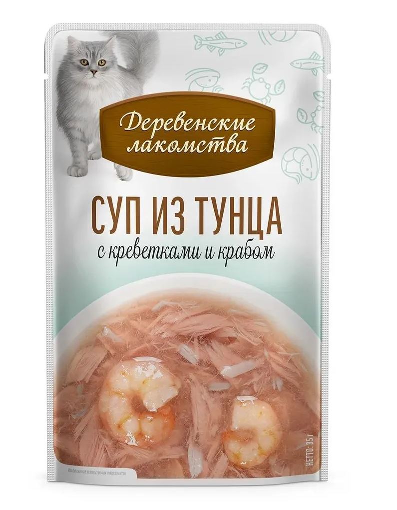 Деревенские лакомства Суп из тунца с креветками и крабом - густой аппетитный бульон с нежнейшим тунцом, креветками и крабом — превосходное угощение для кошек.