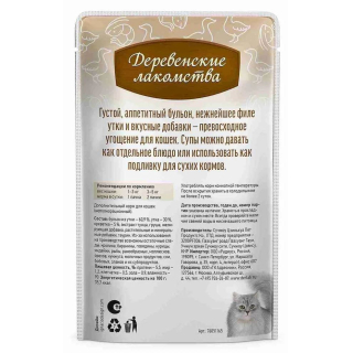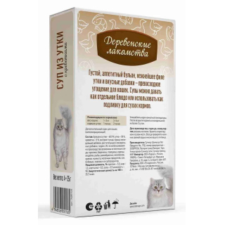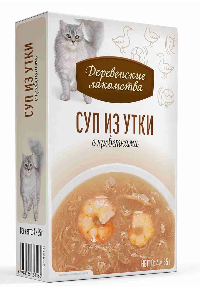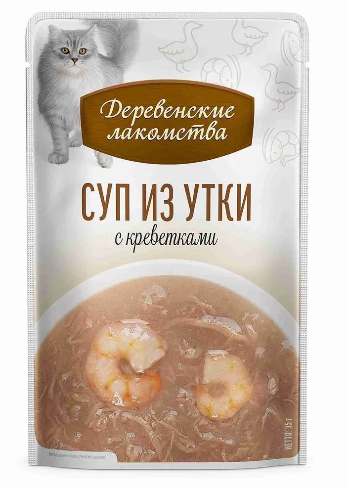 Деревенские лакомства Суп из утки с креветкой — деликатес, достойный самого взыскательного кошачьего гурмана. Нежная текстура супа позволяет кошке без труда насладиться каждым кусочком. Только натуральные ингредиенты, тщательно отобранные для обеспечения максимальной пользы и удовольствия. Густой бульон помогает поддерживать водный баланс организма, обеспечивает необходимые питательные вещества и стимулирует аппетит.