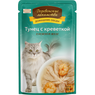 Деревенские лакомства влажный корм для кошек (тунец с креветкой в нежном желе), 70г