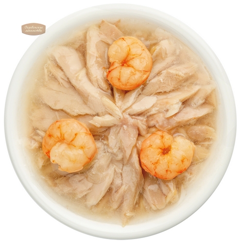 Кусочки тунца с нежными креветками — еда для настоящих аристократов! Витамины, минералы и таурин — это лишь приятное дополнение к изысканному блюду для котов и кошек всех пород.