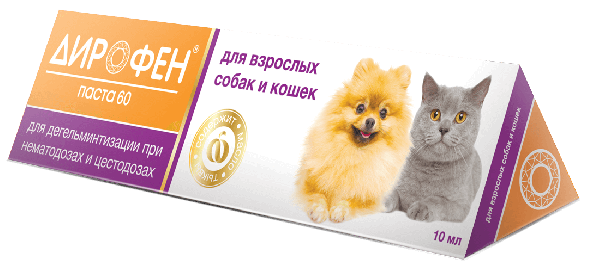 взрослым собакам и кошкам — 1 мл Дирофен-пасты 60 на 3 кг массы животного.