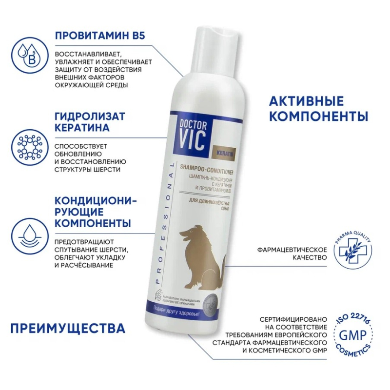 Doctor VIC Шампунь-кондиционер для длинношерстных собак с кератином и провитамином В5, 250 мл