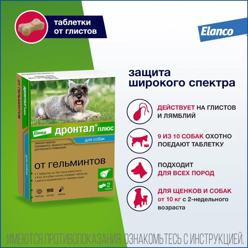 Дронтал®плюс, таблетки от глистов и простейших для собак, – препарат от компании Elanco, помогающий избавить вашего питомца от самых распространенных внутренних паразитов – круглых и ленточных гельминтов, а также от простейших – лямблий.