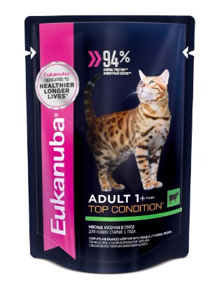 Корм консервированный сбалансированный полнорационный EUKANUBA™ с говядиной в соусе для кошек Adult Top Condition - влажный корм для взрослых кошек старше 1 года с высококачественным животным белком для поддержания кошек на пике формы.