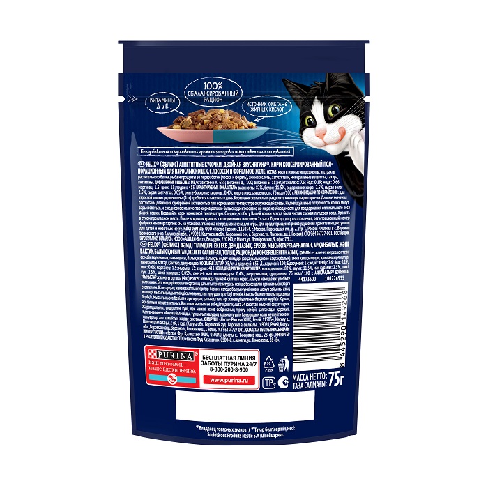 Felix Корм консервированный для кошек двойная вкуснятина (лосось,форель в желе), 75г