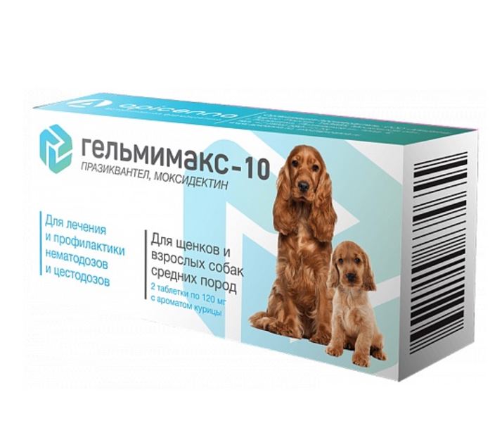 Гельмимакс-10 «для взрослых кошек более 4 кг, щенков и взрослых собак средних пород»: празиквантел — 50 мг/табл., моксидектин — 2,5 мг/табл.