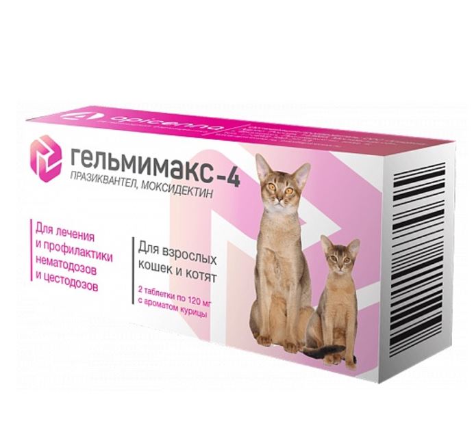 Apicenna Гельмимакс-4 для кошек - препарат для лечения и профилактики нематодозов и цестодозов, а так же профилактики дирофиляриоза у кошек.