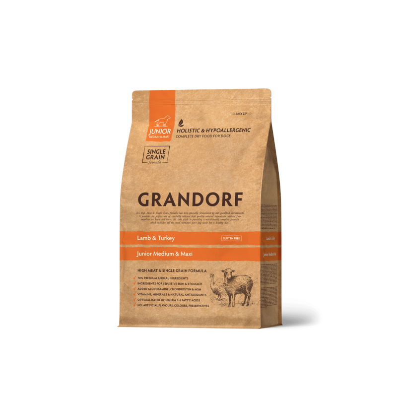 Grandorf Junior Medium & Maxi (Ягненок и индейка) - это гипоаллергенный корм для юниоров в возрасте от 4 месяцев, беременных и кормящих сук средних и крупных пород. Рацион идеально подходит для нежной пищеварительной системы питомца, содержит большое количество протеинов, полезных жиров, витаминов и аминокислот, которые способствуют здоровому росту и развитию.