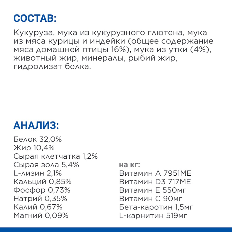 Состав: кукуруза, мука из кукурузного глютена, мука из мяса курицы и индейки (общее содержание мяса домашней птицы -16%), мука из мяса утки (4%), животный жир, минералы, рыбий жир, гидролизат белка.