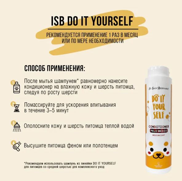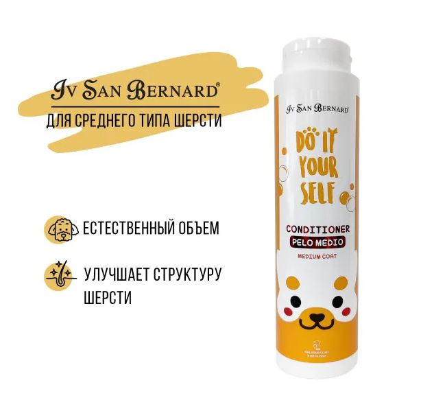Iv San Bernard Кондиционер DO IT YOURSELF для кошек и собак со средней шерстью – специальный кондиционер для кошек и собак со средней шерстью. Обеспечивает питание и увлажнение кожи и шерсти, устраняет статику, улучшает структуру шерсти, придает мягкость, блеск и естественный объем.