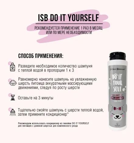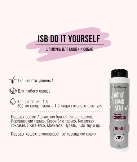 Iv San Bernard Шампунь DO IT YOURSELF для кошек и собак с длинной шерстью – специальный шампунь для длинношерстных кошек и собак. Обладает нежным очищающим действием, хорошо увлажняет кожу, придает шерсти гладкость и блеск. При регулярном применении делает шерсть густой и послушной. В своем составе содержит льняное масло, которое отлично разглаживает волосы, а также защищает их от пересушивания, повреждений и спутывания.