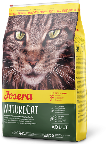 JOSERA NatureCat - настоящее удовольствие для всех искателей приключений. Беззерновой корм содержит легкоусвояемое мясо домашней птицы и мясо лосося для котов и котят (от 6 месяцев) страдающих непереносимостью злаковых культур. Так же, данный корм подойдет для молодых, активных и привередливых кошек.