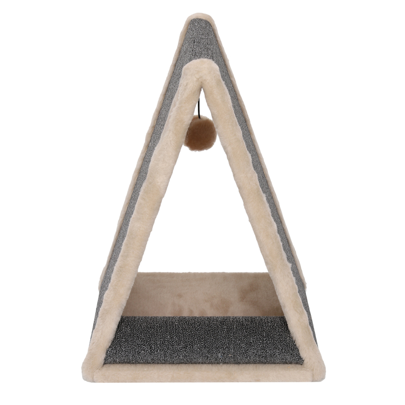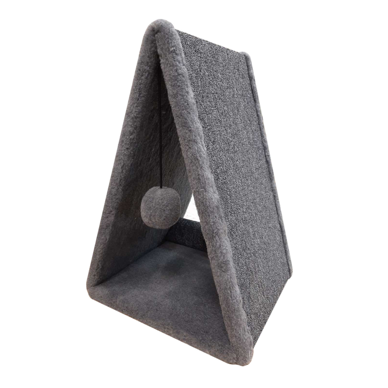 Когтеточка в форме треугольника - это прекрасный подарок вашему коту. Поверхность для точения когтей выполнена из ковролина, остальная часть комплекса покрыта мягким плюшем. Для игр предусмотрен шарик на резинке, который обязательно привлечет внимание питомца.