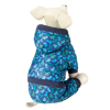 Комбинезон садится "по фигуре" питомца и не стесняет его движений во время прогулки. Изделие с модным принтом и капюшоном надежно фиксируется при помощи трех заклепок на животе, а на штанинах предусмотрены удобные резинки, препятствующие попаданию грязи или налипанию снега снизу.