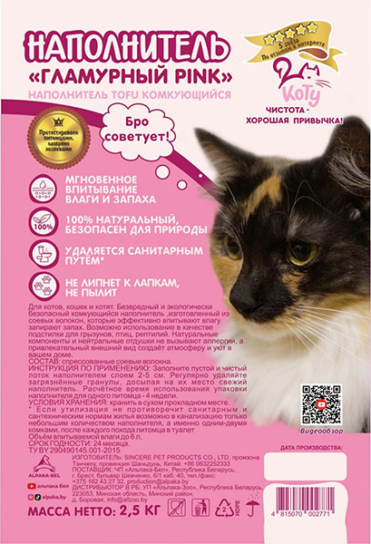 КОТУ Наполнитель TOFU Гламурный PINK - это комкующийся соевый наполнитель для кошачьих туалетов. Благодаря волокнистой структуре, при попадании жидкости соевые гранулы образуют крепкий комок и надежно запирают запах внутри.