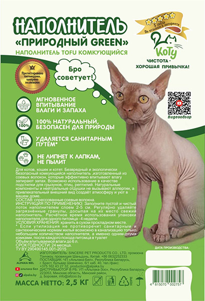 КОТУ Наполнитель TOFU Природный GREEN - это комкующийся соевый наполнитель для кошачьих туалетов. Благодаря волокнистой структуре, при попадании жидкости соевые гранулы образуют крепкий комок и надежно запирают запах внутри.
