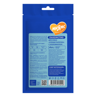 Мнямс ДЕНТАЛ "Зубные палочки" с хлорофиллом – вкусное и полезное лакомство для взрослых собак и щенков старше 3-х месяцев. Обладают высокой вкусовой привлекательностью, предотвращают появление зубного налета, обеспечивают деликатный массаж десен. Благодаря хлорофиллу в составе, способствуют снижению кровоточивости десен, дезодорирует полость рта и освежают дыхание.