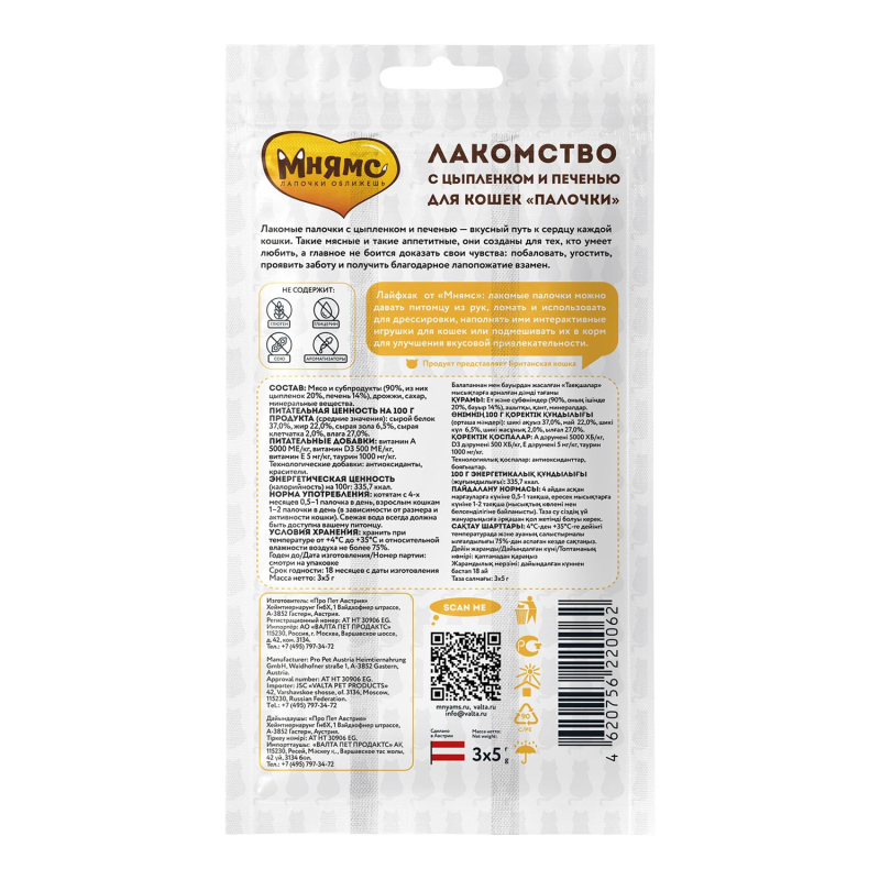 Лакомые палочки с цыпленком и печенью - вкусный путь к сердцу вашей кошки. Лакомые палочки можно давать из рук, ломать и использовать для дрессировки, наполнять ими интерактивные игрушки или подмешивать в корм для улучшения вкусовой привлекательности. В составе палочек более 90% мяса. А также в составе нет злаков, глютена и ароматизаторов. Докажите свою любовь вместе с вкусными и полезными лакомыми палочками ""Мнямс"".