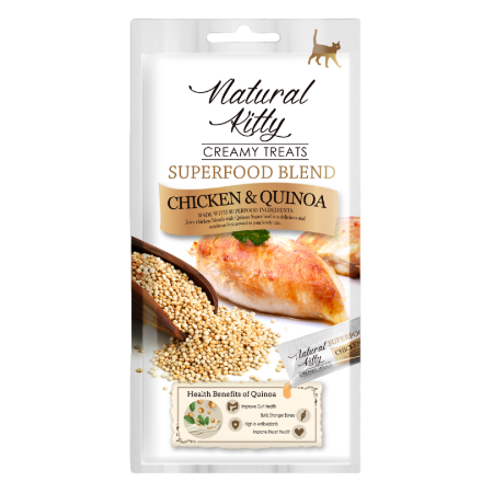 Natural Kitty SUPERFOOD BLEND - Chicken & Quinoa — приготовлено на 100% из куриного мяса с добавлением киноа для улучшения питательных свойств, вкуса лакомства и укрепления здоровья. Это лучшая ежедневная награда для ваших кошек. Вы можете угощать своего питомца этим лакомством каждый день в качестве поощрения, дополнительного корма, а также как добавку к основному рациону.