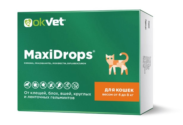 для кошек фипронил - 80 мг, празиквантел - 68 мг, моксидектин - 8 мг и дифлубензурон - 1 мг