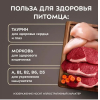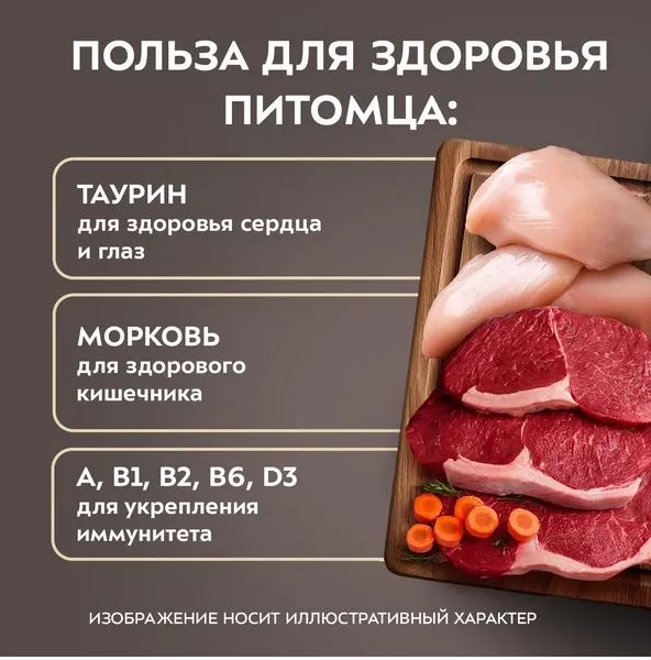 Состав: куриное мясо 50%, куриное сердце 15%, куриная печень 12%, вода, говядина 5%, желток куриного яйца (порошок), куриный жир, картофельный крахмал, карбонат кальция, измельченная морковь, витаминно-минеральный комплекс (хелат железа глицинат, холат меди глицинат, комплекс метионина цинка, комплекс метионина марганца, йодат кальция, - ацетат витамина А, витамин D3, витамин В1, витамин В2, ниацин, витамин В6, витамин В12, DL-а-токоферола ацетат, D-пантотенат кальция, D-биотин, фолиевая кислота, дрожжи (обогащенные селеном), холина хлорид), гуаровая камедь, инактивированные бактерии (Lactobacillus acidophilus) таурин, маннанолигосахариды, фруктоолигосахариды.