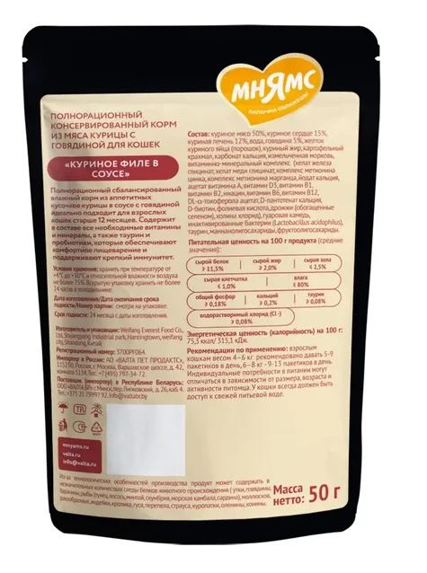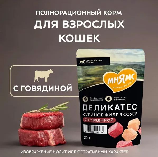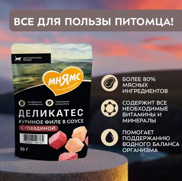 Мнямс Деликатес влажный корм для кошек соус (куриное филе, говядина) 50гр