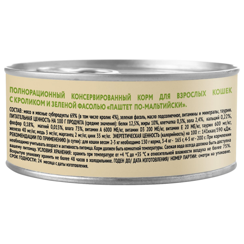 Состав: мясо и мясные субпродукты 69% (в том числе кролик 4%), зеленая фасоль, масло подсолнечное, витамины и минералы, таурин.