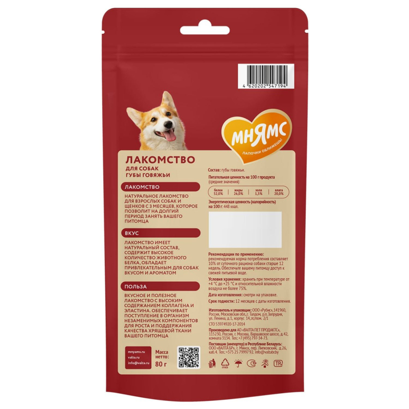 Лакомство Мнямс для собак Губы говяжьи- это вкусное и долгоиграющее лакомство для собак, которое подойдет даже самым привередливым питомцам. Содержит большое количество белка и коллагена для поддержания суставов и связок вашего питомца.
