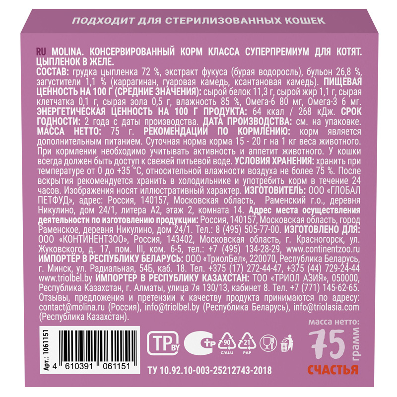 Molina консервы для котят (цыпленок в желе) 75гр