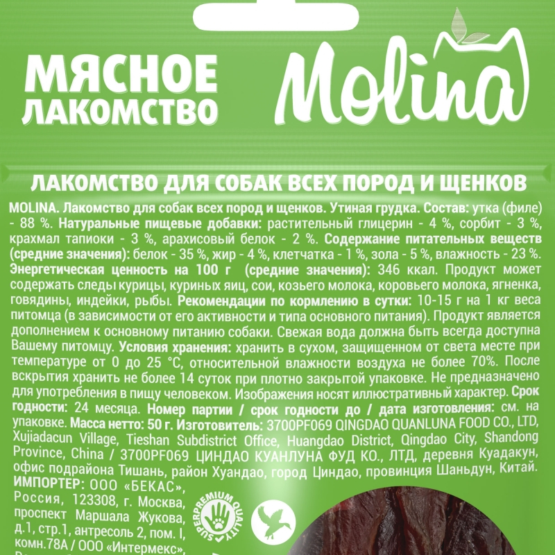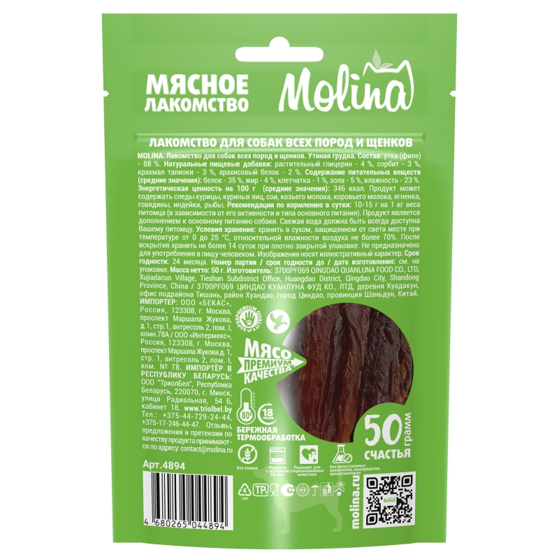 Molina Лакомство для щенков и собак всех пород (утиная грудка), 50г