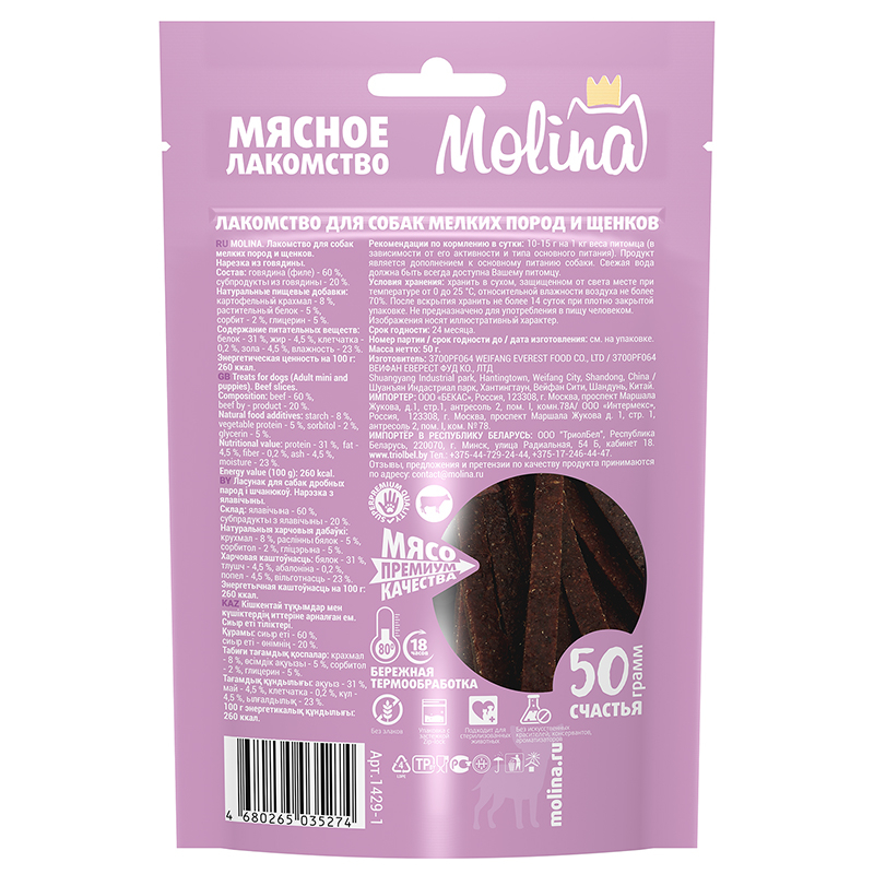 Molina Лакомство для щенков и собак мелких пород (нарезка из говядины), 50г