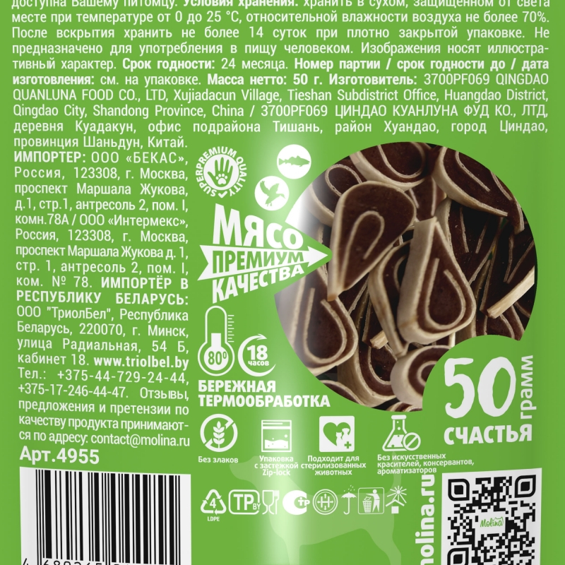 Лакомство Molina Рулетики из утки и трески относится к категории суперпремиум. Ингредиенты в его составе прошли бережную обработку и сохранили всю пользу витаминов и микроэлементов.