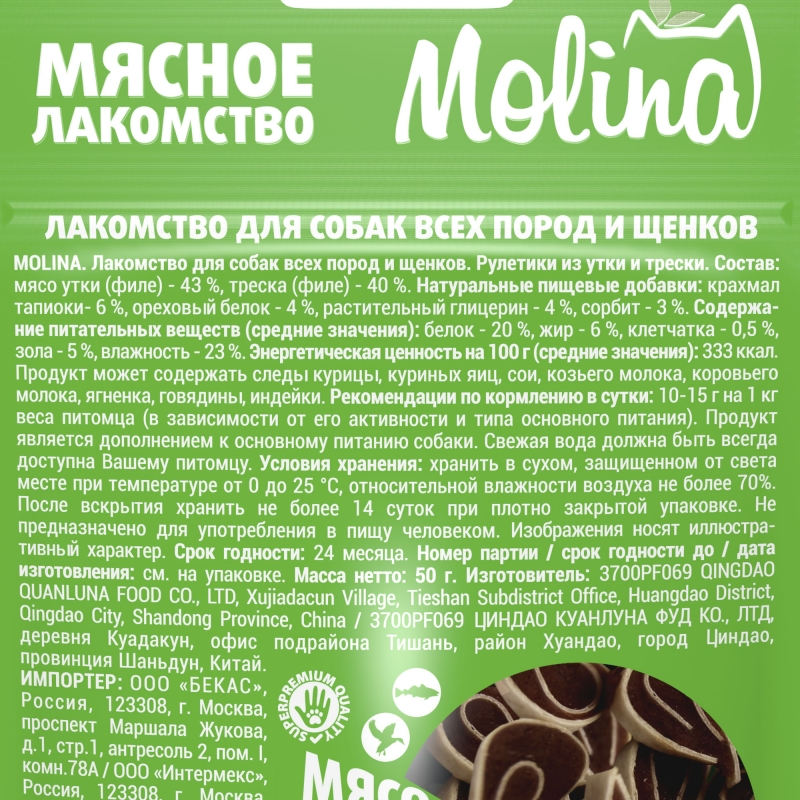 Ингредиенты в составе лакомств Molina для собак всех пород и щенков рулетики из утки и трески: