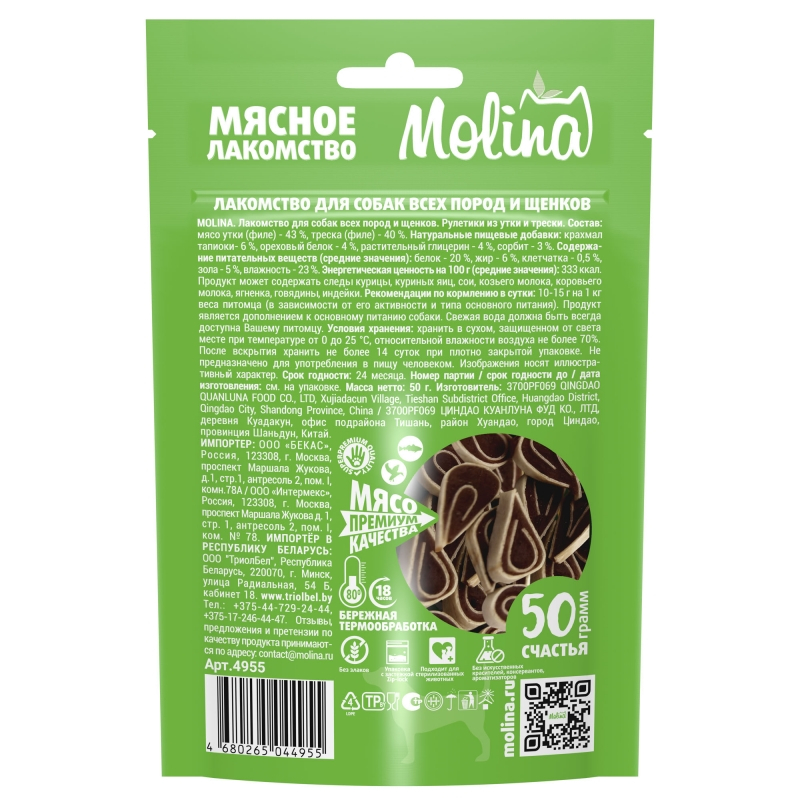 Molina Лакомство для щенков и собак всех пород (рулетики из утки и трески), 50г