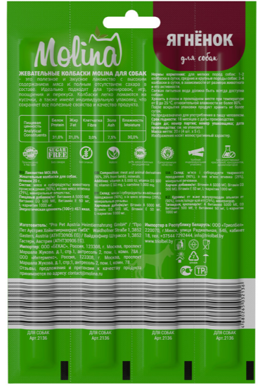 Molina Жевательные колбаски д/собак из ягнененка, 20 гр