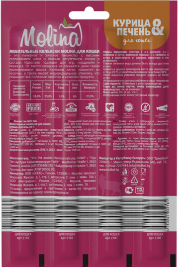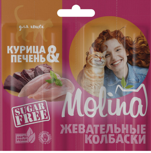 Molina Жевательные колбаски для кошек из курицы и печени, 20 г