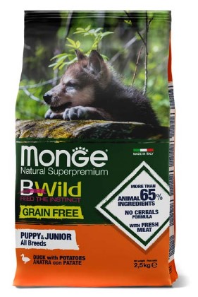 Monge Dog BWild Grain Free Puppy & Junior (Утка, картофель) - это полноценный и сбалансированный корм для щенков. Разработано для благополучия ваших щенков всех пород благодаря выбору альтернативных источников углеводов, не получаемых из злаков, таких как картофель.