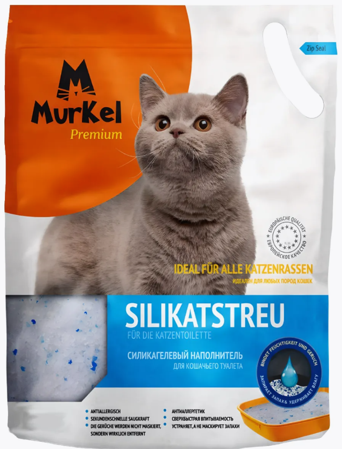 Силикагель имеет большую площадь пор, что позволяет ему легко адсорбировать жидкость. Материал химически неактивен, поэтому полностью безопасен для питомцев и людей. Гранулы не пылят и не прилипают к лапкам кошки, в силикагеле не заводятся плесень и бактерии. В помещении дополнительно устраняются неприятные запахи и излишняя влажность. Упаковка имееь систему Zip-lock, удобный вырез под руку и сделана из утолщенного полиэтилена. Упаковка наполнителя в 4 л расчитана на 25-30 дней для одного питомца. Кошачий лоток необходимо наполнить силикагелевым наполнителем Murkel равномерным слоем в 3-5 см. Если кристаллы утратили свою прозрачность или цветные кристаллы-индикаторы утратили цвет – необходимо произвести полную замену абсорбента. Его выбрасывают, а лоток необходимо чисто помыть, просушить и засыпать новую порцию наполнителя.