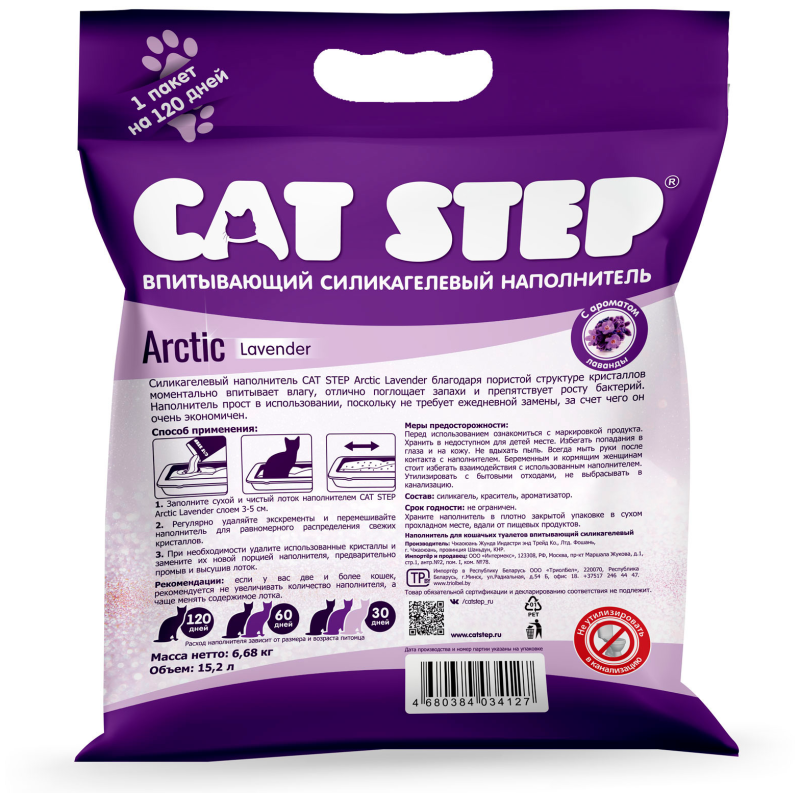 Cat Step Crystal Лаванда - это впитывающий силикагелевый наполнитель для кошачьих туалетов. Моментально впитывает влагу и уничтожает запахи. Кристаллы надолго блокируют неприятный запах, препятствуя его распространению, а фиолетовые гранулы наполняют помещение легким ароматом лаванды.