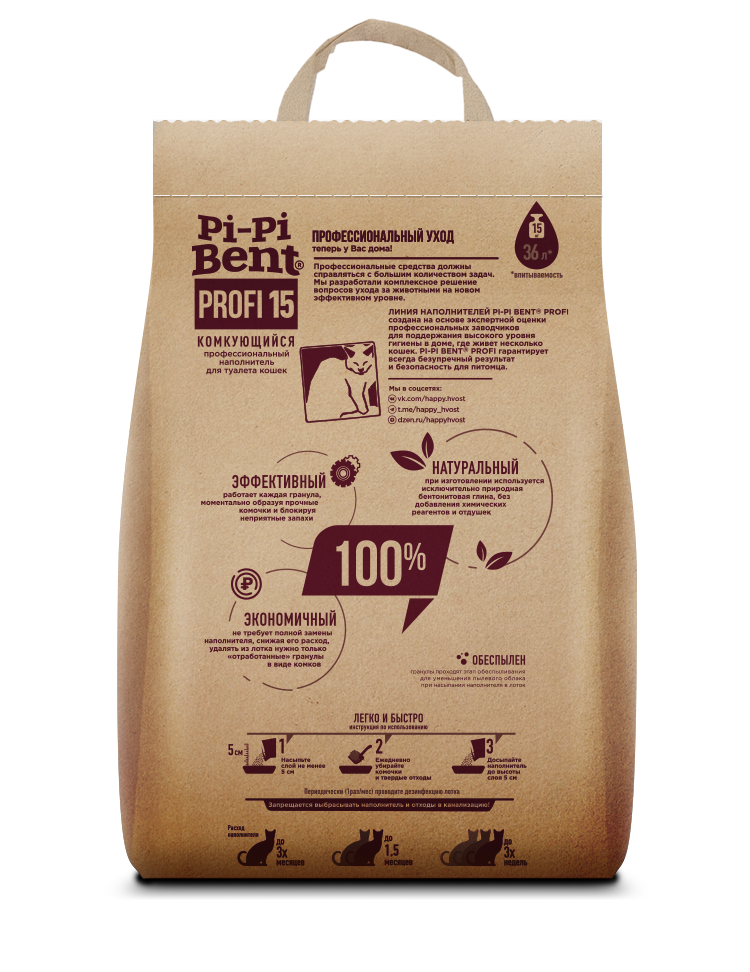 Линейка продуктов подвергается обязательному процессу обеззараживания и обеспыливания. Наполнитель прост в эксплуатации и экономичен. Лоток нужно заполнить на 5 см, а затем удалять комочки по мере их образования, вновь засыпая свежий продукт до прежнего уровня. Лучшее решение – купить наполнитель для кошачьего туалета Pi-Pi-Bent. Для удобства производитель предлагает упаковку весом 15 кг.