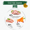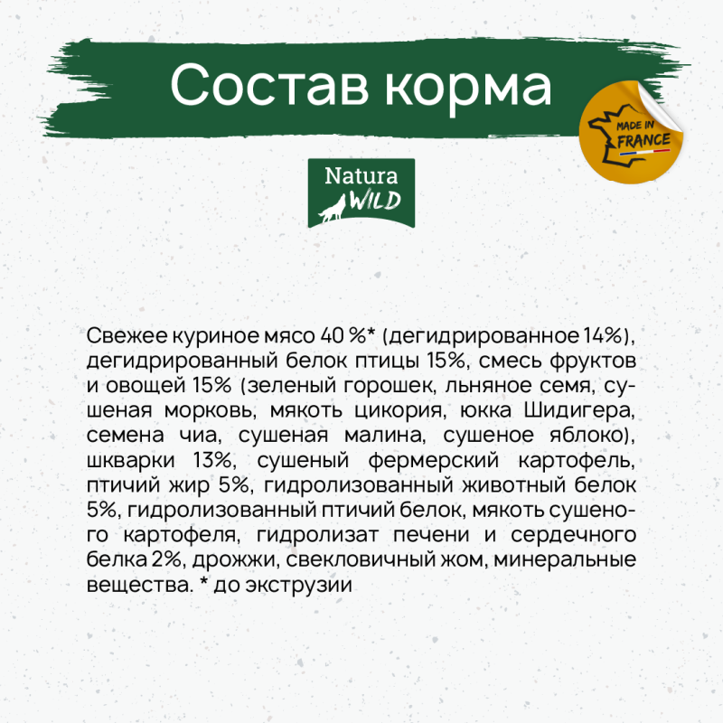 Состав: свежее куриное мясо 40 %* (дегидрированное 14%), дегидрированный белок птицы 15%, смесь фруктов и овощей 15% (зеленый горошек, льняное семя, сушеная морковь, мякоть цикория, юкка Шидигера, семена чиа, сушеная малина, сушеное яблоко), шкварки 13%, сушеный фермерский картофель, птичий жир 5%, гидролизованный животный белок 5%, гидролизованный птичий белок, мякоть сушеного картофеля, гидролизат печени и сердечного