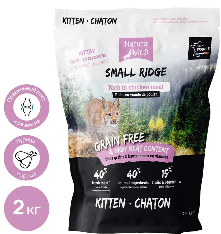 Natura Wild Small Ridge Kitten (курица)- это полнорационный корм для котят без злаков, богатый свежим куриным мясом.