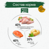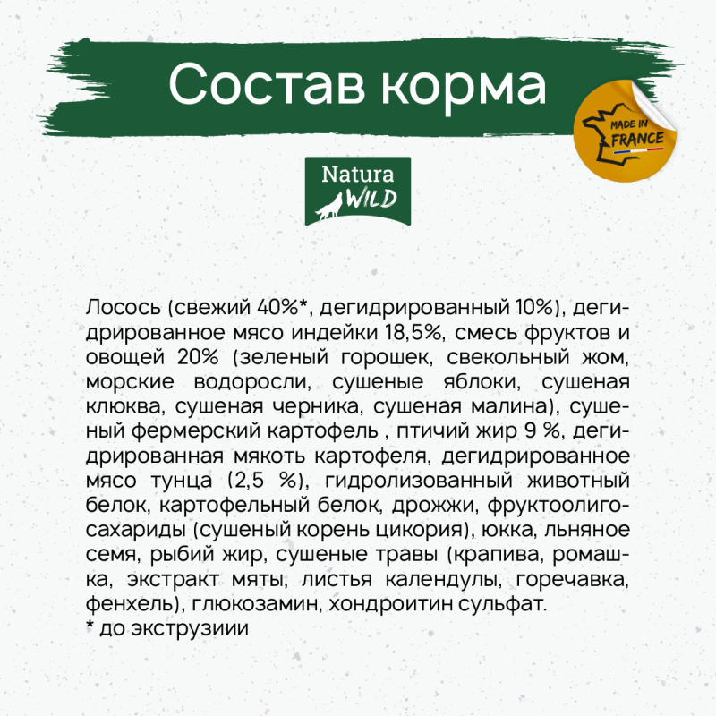 Состав: лосось (свежий 40%*, дегидрированный 10%), дегидрированное мясо индейки 18,5%, смесь фруктов и овощей 20% (зеленый горошек, свекольный жом, морские водоросли, сушеные яблоки, сушеная клюква, сушеная черника, сушеная малина), сушеный фермерский картофель, птичий жир 9%, обезвоженная мякоть картофеля, дегидрированное мясо тунца (2,5%), гидролизованный животный белок, картофельный белок, дрожжи, фруктоолигосахарид (сушеный корень цикория), юкка, льняное семя, рыбий жир, сушеные травы (крапива, ромашка, экстракт мяты, листья календулы, горечавка, фенхель), глюкозамин, хондроитин сульфат. * до экструзией.