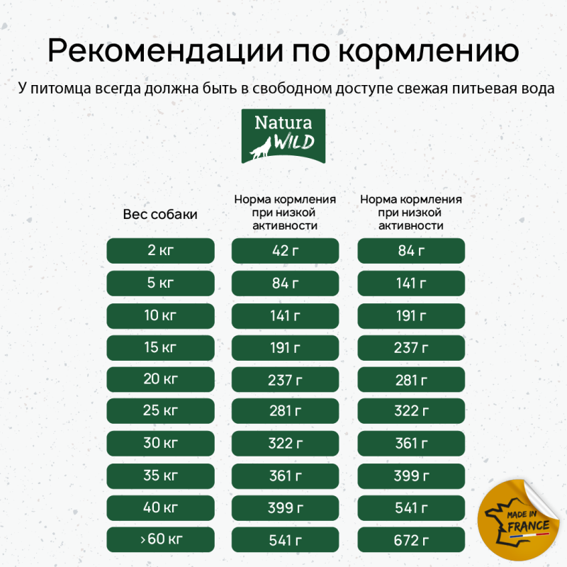 Рекомендации по кормлению: следуйте суточным дозам, указанным в таблице по кормлению. У животного всегда должен быть доступ к свежей питьевой воде.