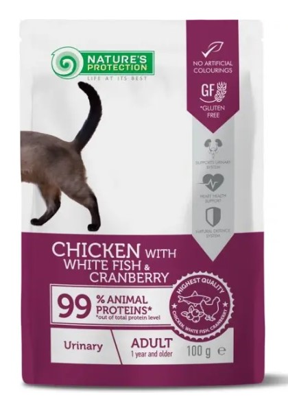 Nature's Protection Консервы Urinary Health (Курица и белая рыба) — влажный корм для взрослых кошек с чувствительной мочеполовой системой с курицей, белой рыбой и клюквой.