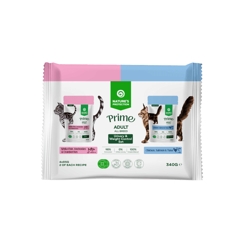 Набор NP Prime Sterilised паучи — набор многофункциональных влажных кормов для взрослых кошек всех пород, с белой рыбой, анчоусами и клюквой, с курицей, лососем и тунцом.