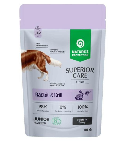 "Полноценный беззерновой влажный корм Nature's Protection Superior Care с крольчатиной и крилем создан для юниоров всех пород. Это забота о ежедневном рационе с учетом потребностей растущего организма: формула с высоким содержанием качественного животного белка, дополненная Microzeogen и специальными активными компонентами, обеспечивающими комплексную поддержку иммунитета, правильного роста, пищеварения и общего здоровья.