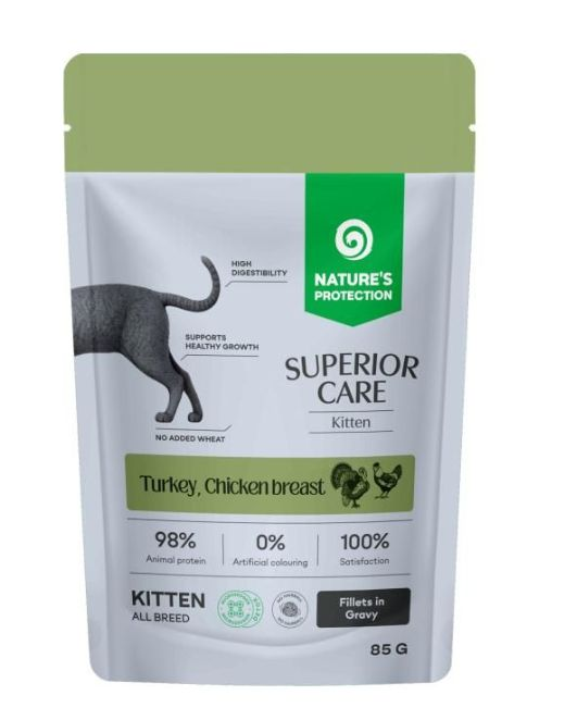 "Полноценный беззерновой влажный корм Nature`s Protection Superior Care с индейкой и куриной грудкой создан для котят всех пород. Это забота о сбалансированном ежедневном рационе с учетом особых потребностей организма в период роста: формула с высоким содержанием животного белка, дополненная необходимыми аминокислотами, витаминами и минералами для поддержания здорового развития котенка, его иммунитета и жизненного тонуса.