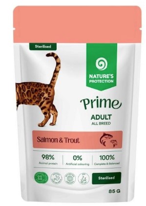 Влажный корм Nature’s Protection Prime для стерилизованных кошек, с лососем и форелью — это полнорационный и сбалансированный продукт, разработанный для поддержания здоровья, энергии и общего благополучия питомца после стерилизации. Для взрослых кошек всех пород. Если кошка склонна к набору веса после стерилизации, в корме добавлен L-карнитин. Если кошке нужно больше влаги в рационе и улучшение пищеварения. Если шерсть кошки тускнеет - лосось и форель обеспечивают Омега-3. Если кошка привередлива и любит филе в соусе.